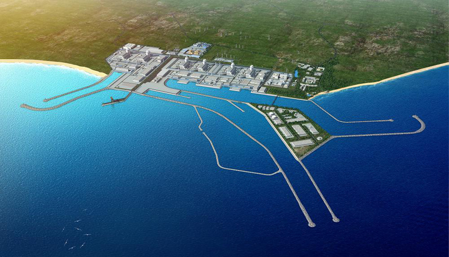 核电厂取排水工程采用“南北取中间排”的双取水口布置型式,取排水防波堤、护岸总长度超过10公里。