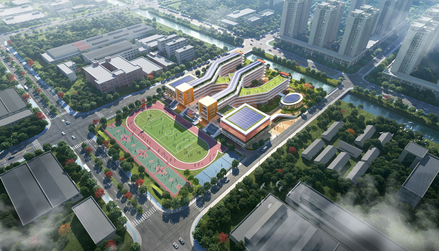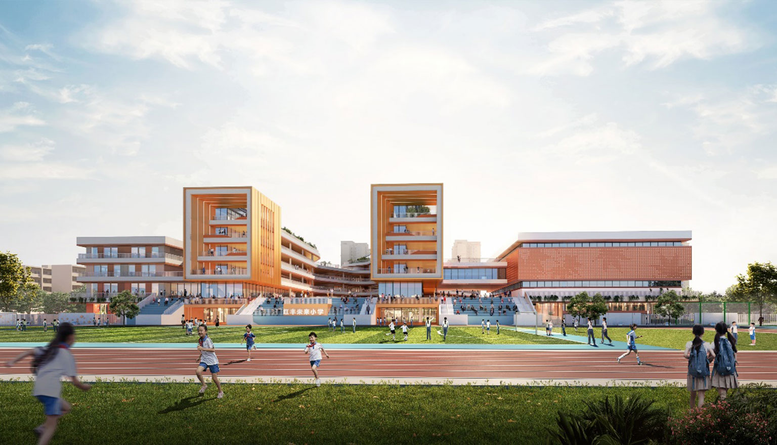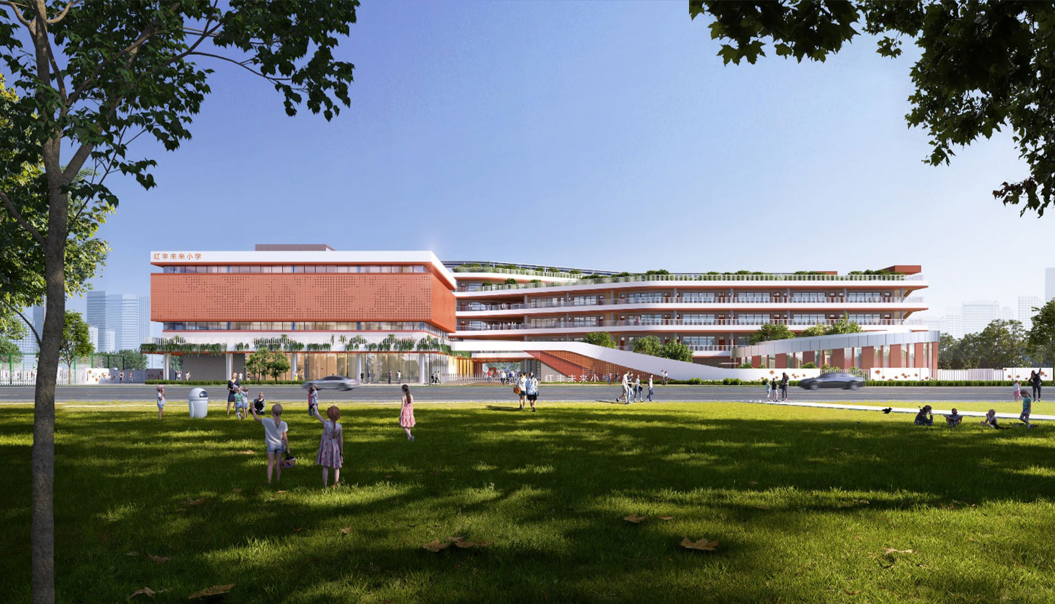 项目位于杭州市余杭区红丰创新带的核心位置,总用地面积31033 平方米,总建筑面积30410 平方米。项目为36班小学,以“红枫”为主题元素,力求打造一个花园式、体现地域型的超低能耗绿色校园。
