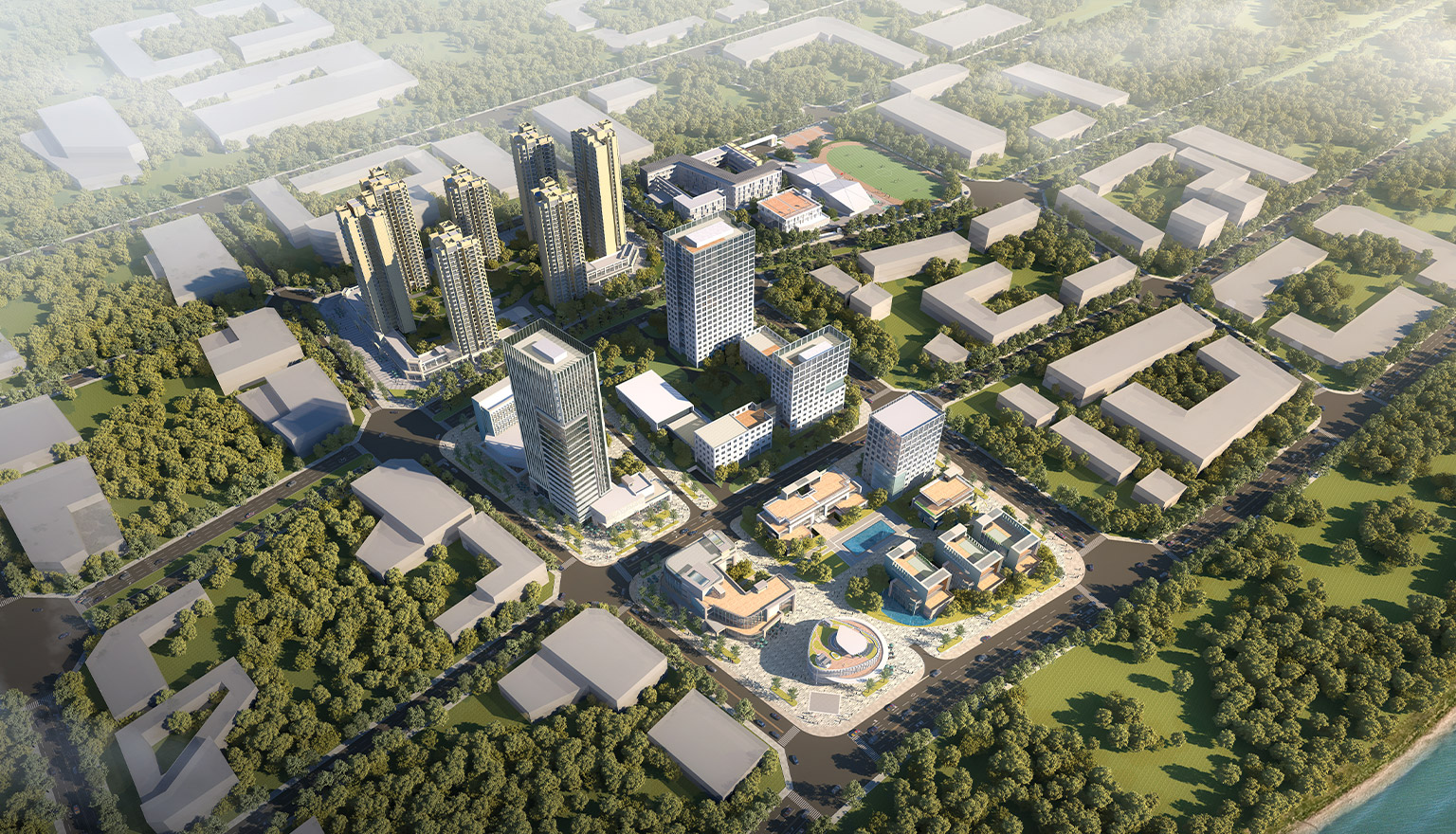 项目位于成都市天府新区科学城兴隆湖南岸,项目占地多个地块,总用地面积9.6万平方米,总建筑面积约17.6万平方米,其中地上13.2万平方米,地下4.4万平方米。功能包含办公、商业、学校等。